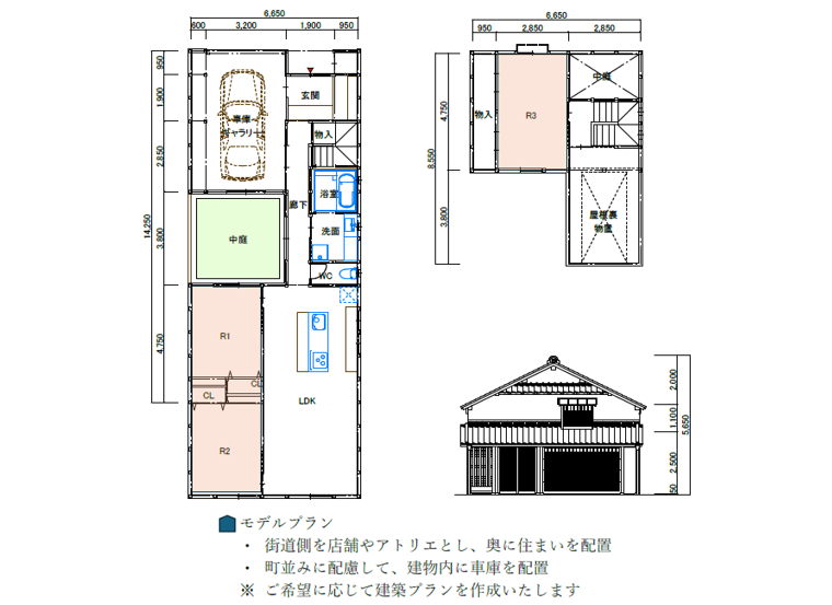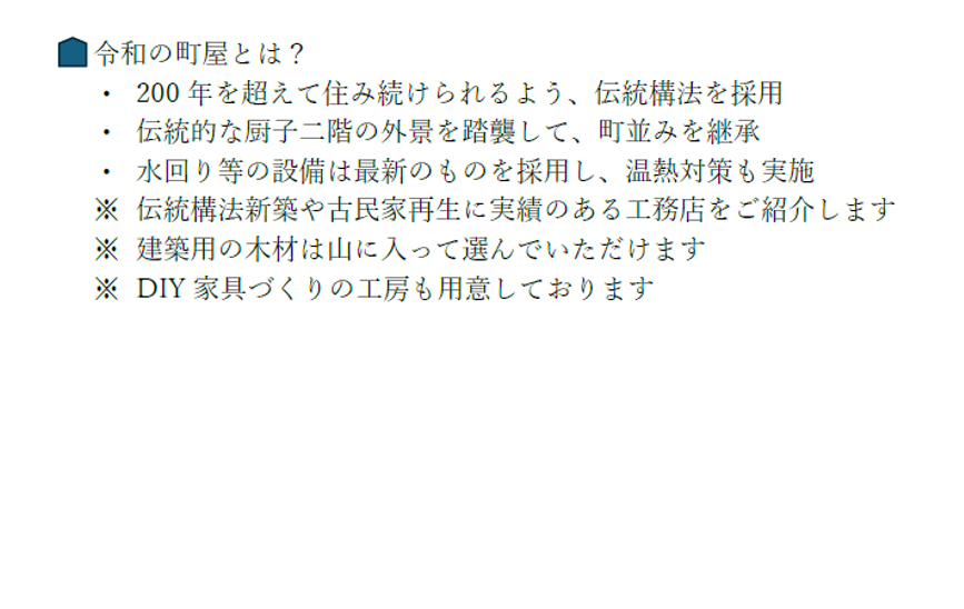 L字型の⻄町通について、古⺠家空き家は再⽣活⽤し、空き地に未来の古⺠家を建築することで、⻄暦 2100 年には伝統的建造物群保存地区にしたいと考えています。今回のプロジェクトが、その新築事業の第1号案件となります。